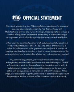 Ante la creciente polémica, la Federación Internacional del Automóvil emitió un comunicado oficial intentando apaciguar el descontento. El organismo reconoció que el reglamento 2026 ha estado en “debate continuo” desde su concepción y subrayó que existen parámetros ajustables, especialmente en la gestión de la energía.